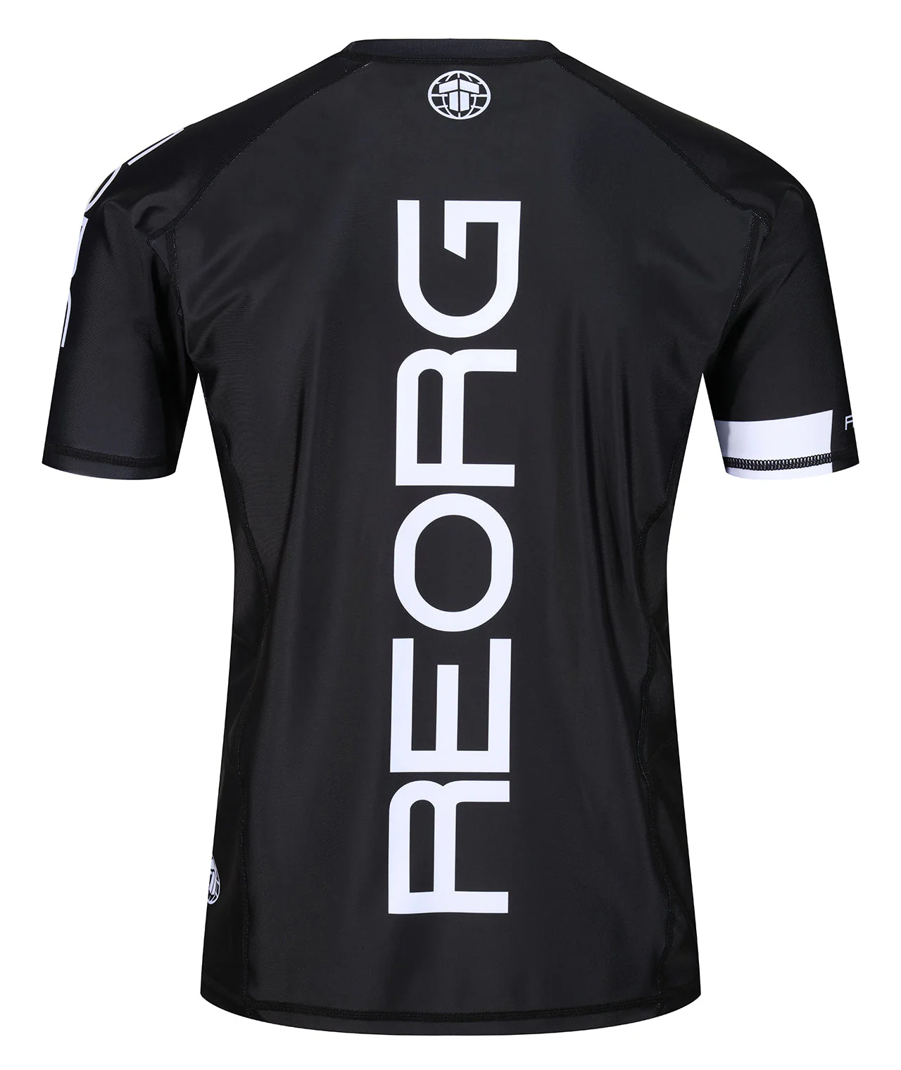 - Large Reorg logo down the back of rash guard