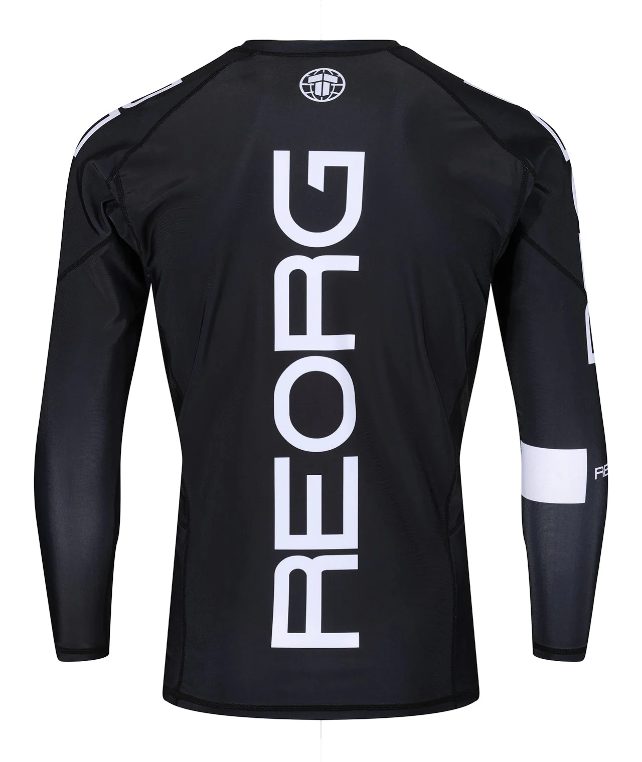 - Large Reorg logo down the back of rash guard